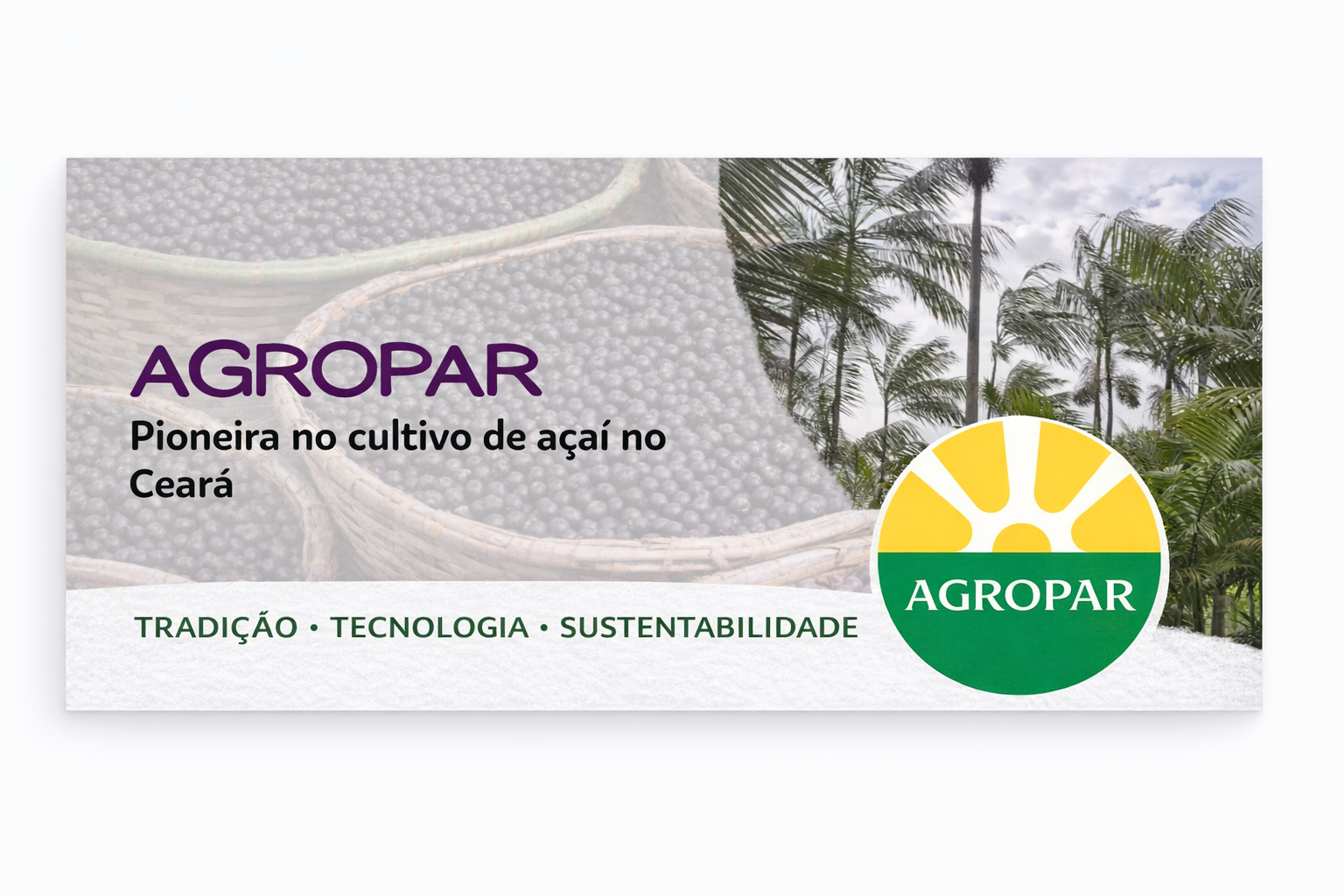 A Agropar oferece polpa de açaí premium, açaí em pó, mudas e assistência ao produtor, além de serviços de comercialização e exportação, com foco em produção sustentável, origem controlada e práticas responsáveis.